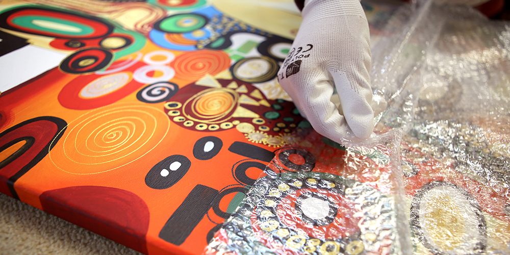 Passados três dias (no máximo) o quadro está seco e pronto para ser colocado na sua parede. Agora é preciso preparar a embalagem. Para que nenhuma parte fique estragada em transporte, protegimos a tela com o plástico-bolha e embrulhamo-la em filme stretch resistente.