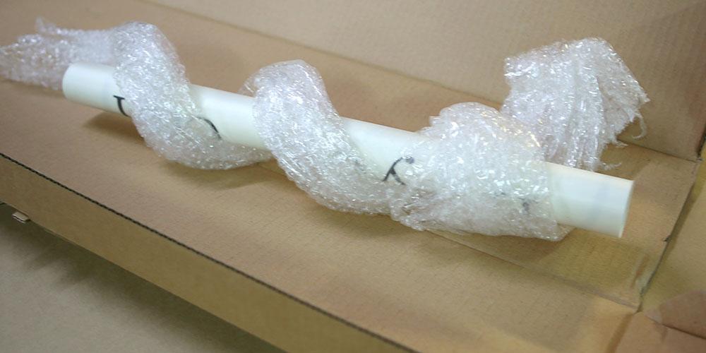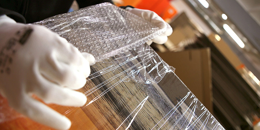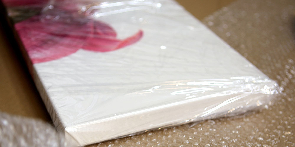 O que é preciso é filme stretch e muito plástico-bolha para que o quadro esteja entregue nas suas mãos sem danos! Embrulhamos cada uma das partes do quadro separadamente e logo tudo junto uma vez mais fica coberto com uma camada grossa de plástico-bolha.