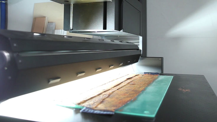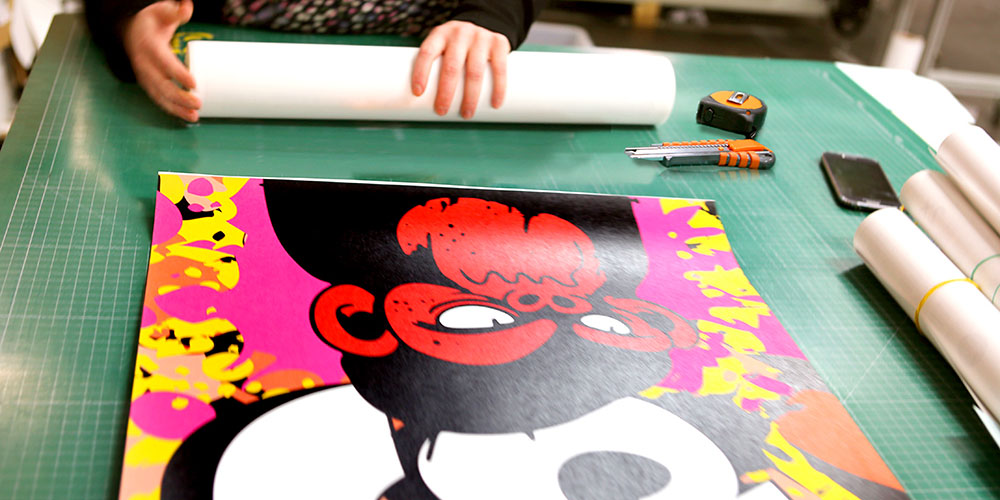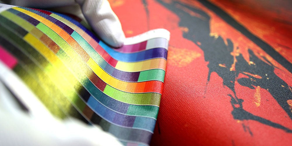 Primeiro: imprimir desenho nas melhores impressoras suiças, em tela italiana 100% algadão. Logo: cortar. Os fragmentos do desenho cortam-se manualmente em faixas separadas que logo ficarão esticadas em bastidores.