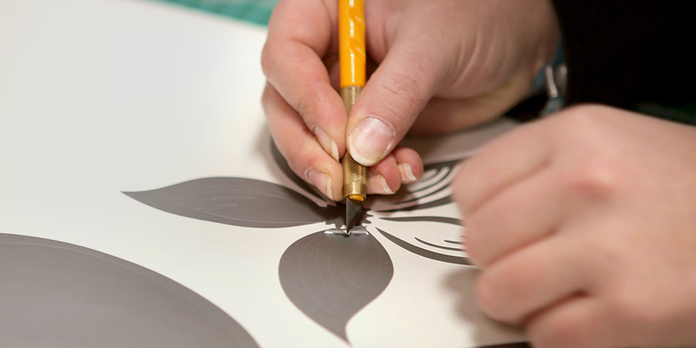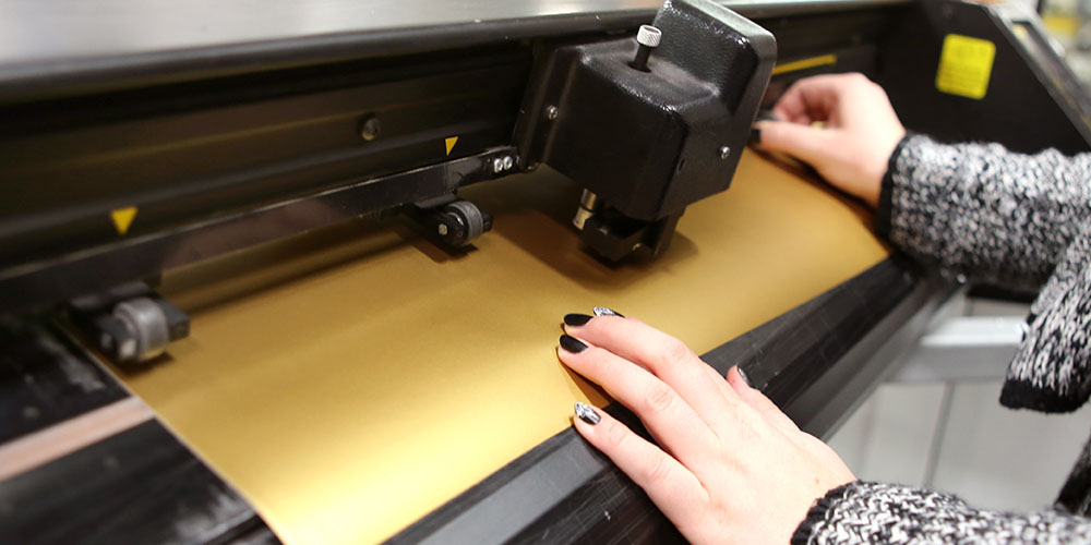 Colocamos a folha adesiva num ploter especial, confirmamos a ação de cortar e logo... a folha parece igual. Mas as aparências enganam! De perto pode-se ver as linhas de corte que traçam um desenho, o autocolante que encomendou.