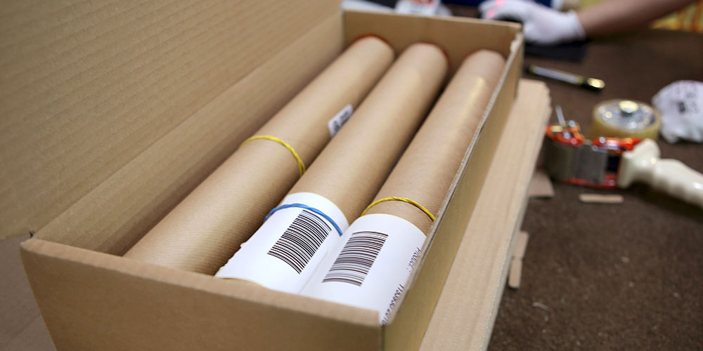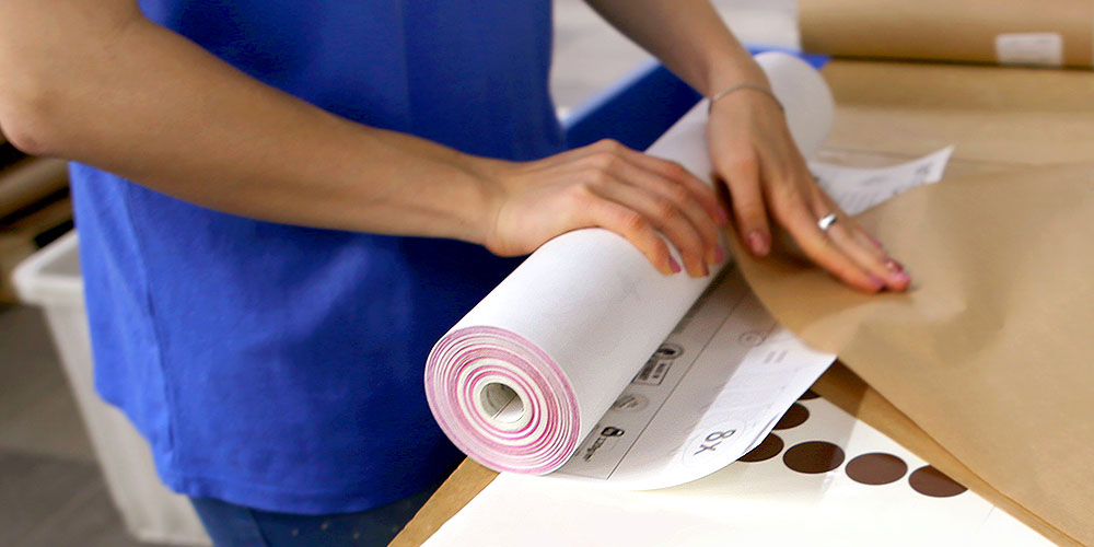 O fotomural está verificado? Isto significa que vem o momento para o embalar. Primeiro é preciso segurar o produto para que não haja danos em transporte por isso o rolo fica envolto cuidadosamente em papel grosso.